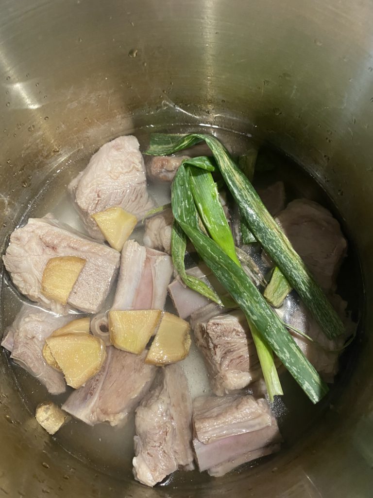 ① 豚のスペアリブを水から沸騰するまで茹でる。